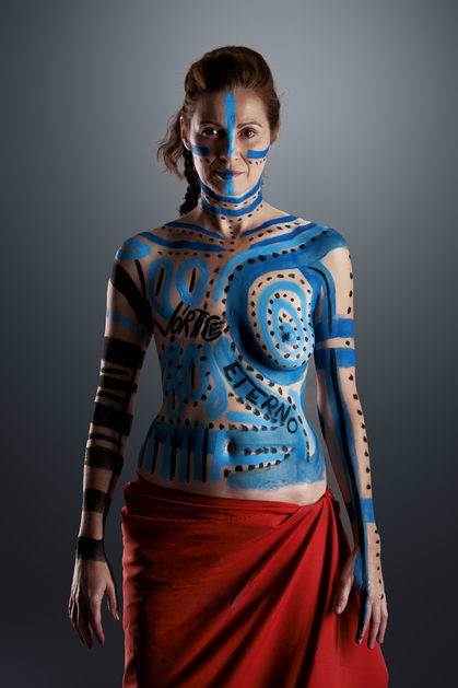 Ahora, viendo las fotos, siento que el resultado no puede estar más en sintonía con lo que yo imaginaba. Durante la sesión, según Elena me iba pintando, me sentí fuerte, libre y sosegada a un tiempo. El pareo naranja enraizó fuertemente mi energía sexual a la madre tierra mientras que las líneas azules entablaron un sensual diálogo con el padre cielo convirtiéndome en ese vórtice eterno de lo femenino creador de vida.